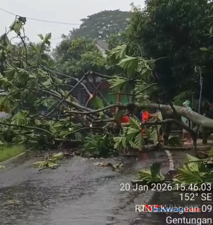 Karanganyar | benuapostnusantara.com | Hujan deras yang disertai angin kencang mengakibatkan sebuah pohon berukuran besar tumbang dan menutup badan jalan di wilayah RT 05 Kwagean 09, Desa Gentungan, Kecamatan Mojogedang, Kabupaten Karanganyar, Jawa Tengah, Selasa (20/1/2026).